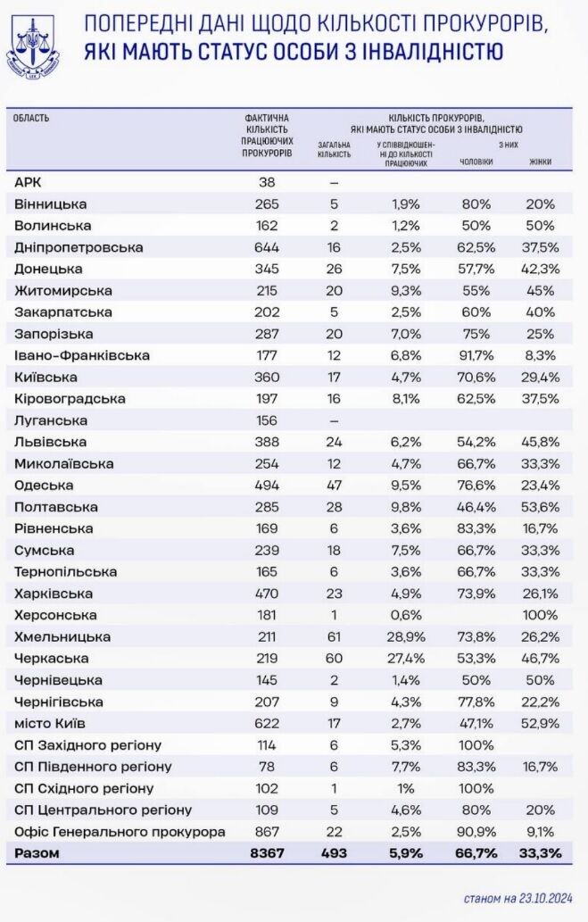 Согласно таблице, опубликованной в ведомстве, инвалидность есть у 493 прокуроров из 8367 работающих. Самый высокий процент – у работников прокуратуры Хмельницкой (28,9%, 61 прокурор имеет инвалидность) и Черкасской областей (27,4%, 60 прокуроров), самый низкий – Херсонской (0,6%, инвалидность имеет один прокурор из 181). В целом во всех областях, кроме Хмельницкой и Черкасской, прокуроров с инвалидностью меньше 10%.