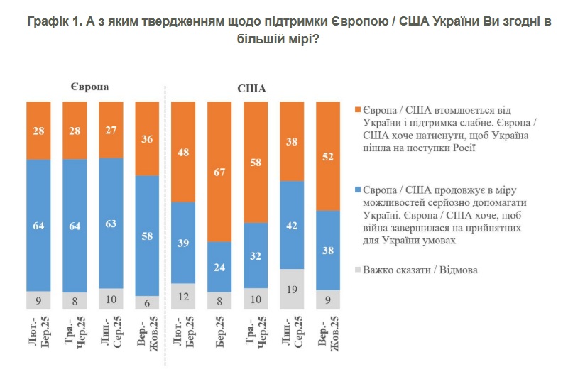"В случае восприятия политики США ситуация в течение этого года очень динамичная. Так, в марте этого года мы фиксировали самый низкий показатель позитивного восприятия политики США – только 24% считали США надежным союзником Украины. [...] В начале октября мы видим, что [...] с 38% до 52% возросла доля тех, кто считает, что США устали и давят на Украину для одобрения несправедливого мира", – пишет КМИС.