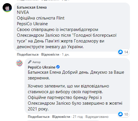 В частности, бренд PepsiCo Ukraine в комментариях к своему посту заявил, что они завершили сотрудничество с Залиско еще в октябре.