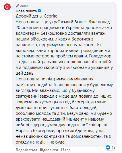 Также на ситуацию в комментариях под своим постом отреагировала и "Новая пошта", заявив, что не поддерживает высмеивание памятных событий и их обесценивание в любом виде.