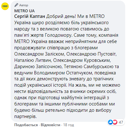Сеть магазинов METRO в комментариях под своим постом назвала неприемлемым для себя продолжение сотрудничества с блогерами Залиско, Александрой Пустовит, Наталией Литвин, Александром Куровским, Дарьей Записочной, Татьяной Самбурской и ведущим Владимиром Остапчуком.