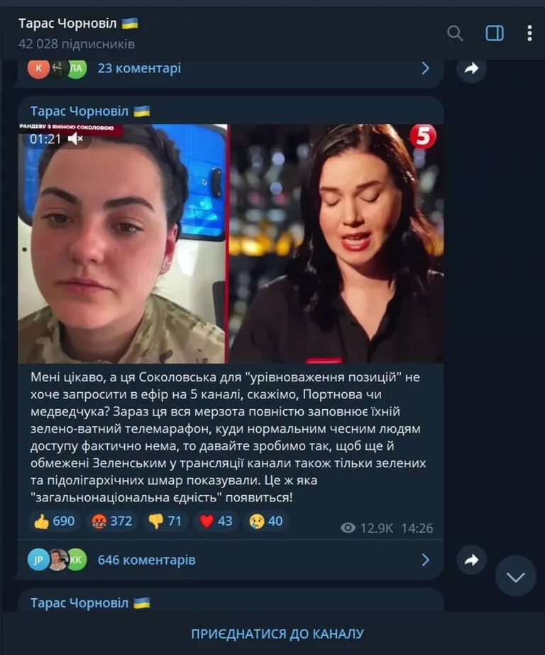 29 мая он опубликовал в Telegram фрагмент интервью Михайловой украинской журналистке Янине Соколовой, где назвал парамедика "подолигархической шмарой", возмутился, что якобы "зелено-ватных мразей" приглашают на передачи, а "честным людям" и слова не дают сказать. Позже Чорновил удалил это сообщение.