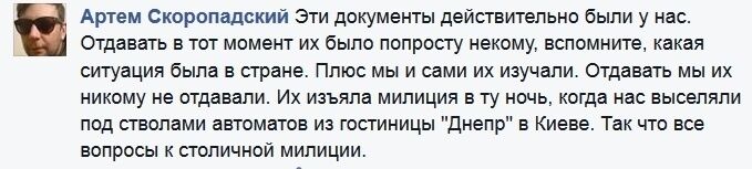 Но пресс-секретарь "Правого сектора" Артем Скоропадский опроверг заявление народного депутата от Блока Петра Порошенко Мустафы Найема о том, что у членов организации сохраняются материалы уголовных дел против экс-премьера, лидера "Батьківщини" Юлии Тимошенко. Об этом в пятницу, 10 апреля, "Мы не готовы их отдать, потому что у нас их нет", – отметил Скоропадский. По его словам, сразу после окончания Евромайдана в феврале 2014 года эти документы действительно сохранялись у "Правого сектора". "Отдавать в тот момент их было попросту некому, вспомните, какая ситуация была в стране. Плюс мы и сами их изучали. <...> Их изъяла милиция в ту ночь, когда нас выселяли под дулами автоматов из гостиницы "Днепр" в Киеве. Так что все вопросы к столичной милиции", – добавил Скоропадский.