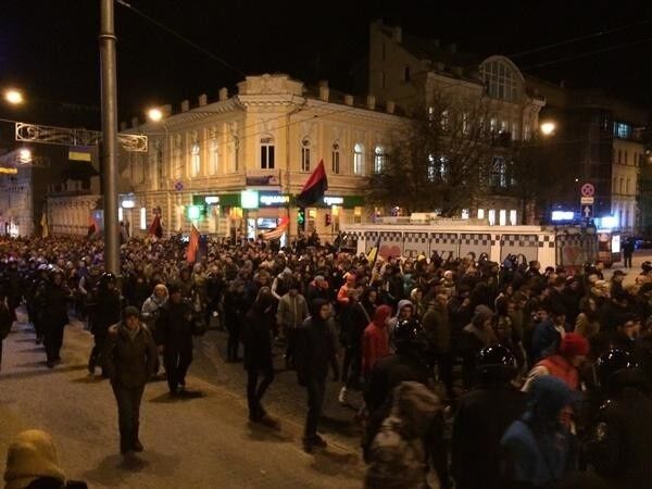 В центре Киева ВО "Свобода" и "Правый сектор" провели "Марш героев" по случаю дня создания УПА. На демонстрацию на Михайловской площади собрались несколько тысяч человек. Демонстранты прошли колонной к Лукьяновскому СИЗО, где запланирован концерт в поддержку арестованных свободовцев c лозунгами "Бандера – наш герой, Покрова – наш праздник". Позже участники акции переместятся к изолятору временного содержания в Косогорном переулке, где тоже содержатся арестованные националисты.