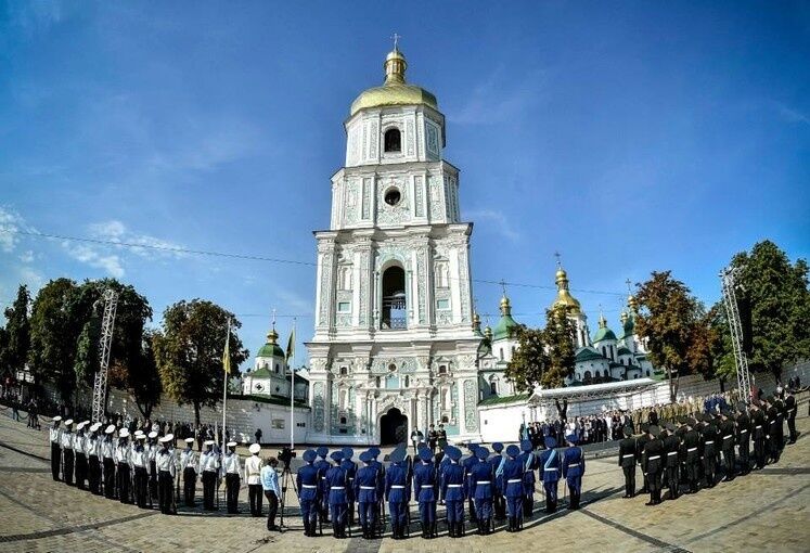 На Софийской площади в Киеве прошла церемония поднятия национального знамени. Эта честь выпала бойцу Мирославу Гаю, который участвовал в освобождении Славянска, о чем рассказал присутствующий на церемонии президент Украины Петр Порошенко. Президент выступил с речью, в которой призвал украинцев к единению.