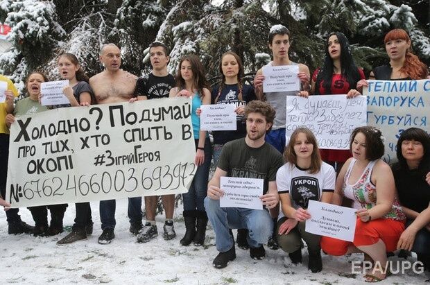 – В центре Киева прошел флешмоб "Согрей солдата" – активисты при отрицательной температуре сбросили верхнюю одежду с призывом к общественности и правительству обратить внимание на плохое обеспечение сил антитеррористической операции зимней экипировкой.