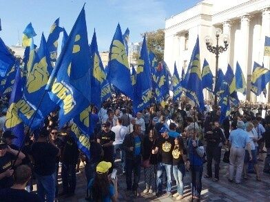 Утром под зданием Верховной Рады Украины в Киеве собрались граждане с символикой Радикальной партии, партий "Свобода" и УКРОП, выступающие против внесения изменений в Конституцию Украины в части децентрализации. В сессионном зале парламента рассмотрение законопроекта сопровождалось скандированием частью нардепов "Ганьба!" и всяческими шумовыми эффектами, а трибуну заблокировали около 10 нардепов от Радикальной партии Олега Ляшко. Несмотря на все это, законопроект был принят в первом чтении 265-ю голосами "за".