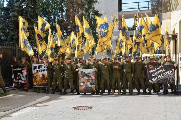 Несколько сотен бойцов полка Национальной гвардии Украины "Азов" митинговали под Государственной фискальной службой (ГФС) в Киеве. На некоторое время они заблокировали вход в здание и не пускали на работу сотрудников ведомства. Бойцы "Азова" держали в руках баннеры, на которых утверждалось, что ГФС работает на сепаратистов.