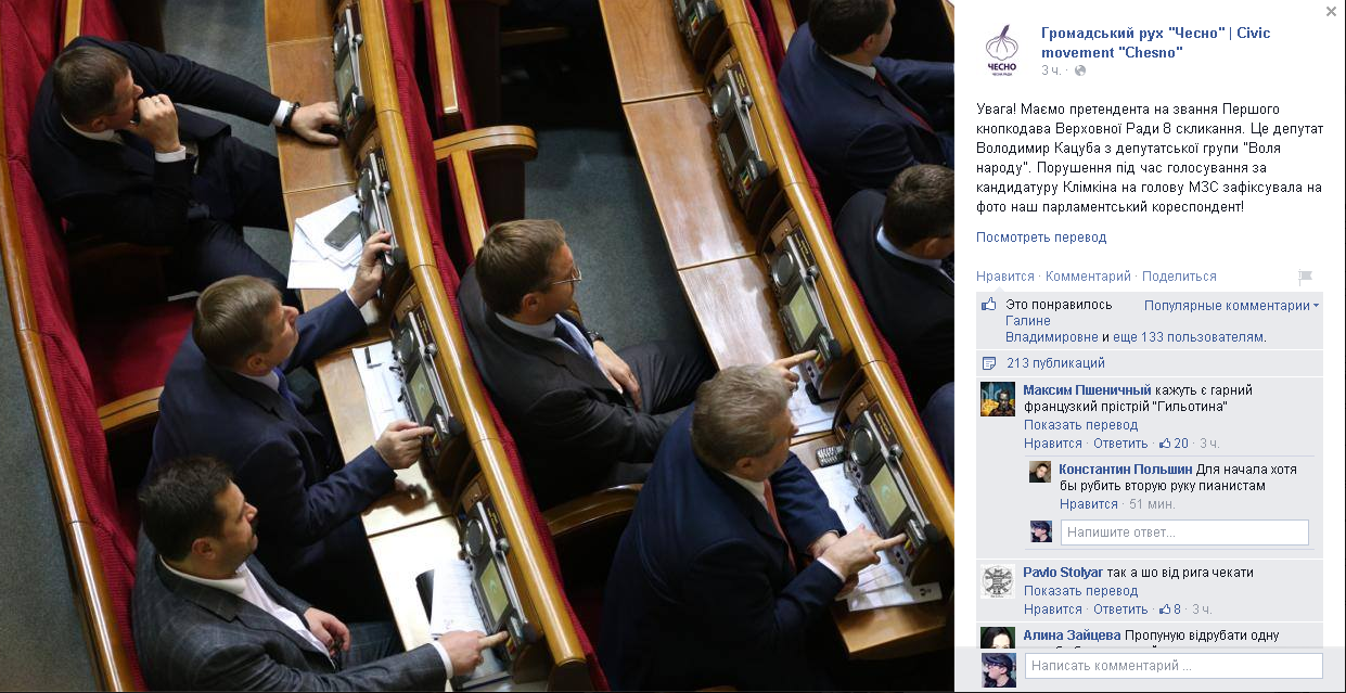 – Во время сегодняшнего заседания Верховной Рады зафиксированы случаи "кнопкодаства" при голосовании за кандидатуру главы МИД Украины Павла Климкина. Общественная организация "Чесно" опубликовала фото, как экс-регионал Владимир Кацуба давит на кнопки за себя и за соседа. Журналист "5 канала" Алексей Братущак также заявил, что во время голосования по кандидатуре главы МИД "кнопкодавила" депутат Елена Колганова от фракции "Народный фронт", и опубликовал соответствующее видео.