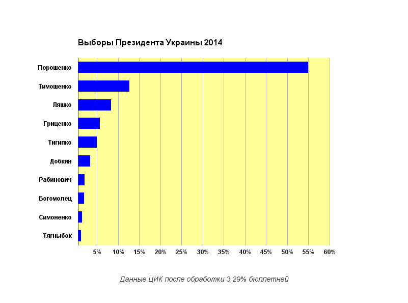 05.1004.45 ЦИК обработала 3,29% протоколов: Порошенко – 54.99%, Тимошенко – 12.65%, Ляшко – 8.28%