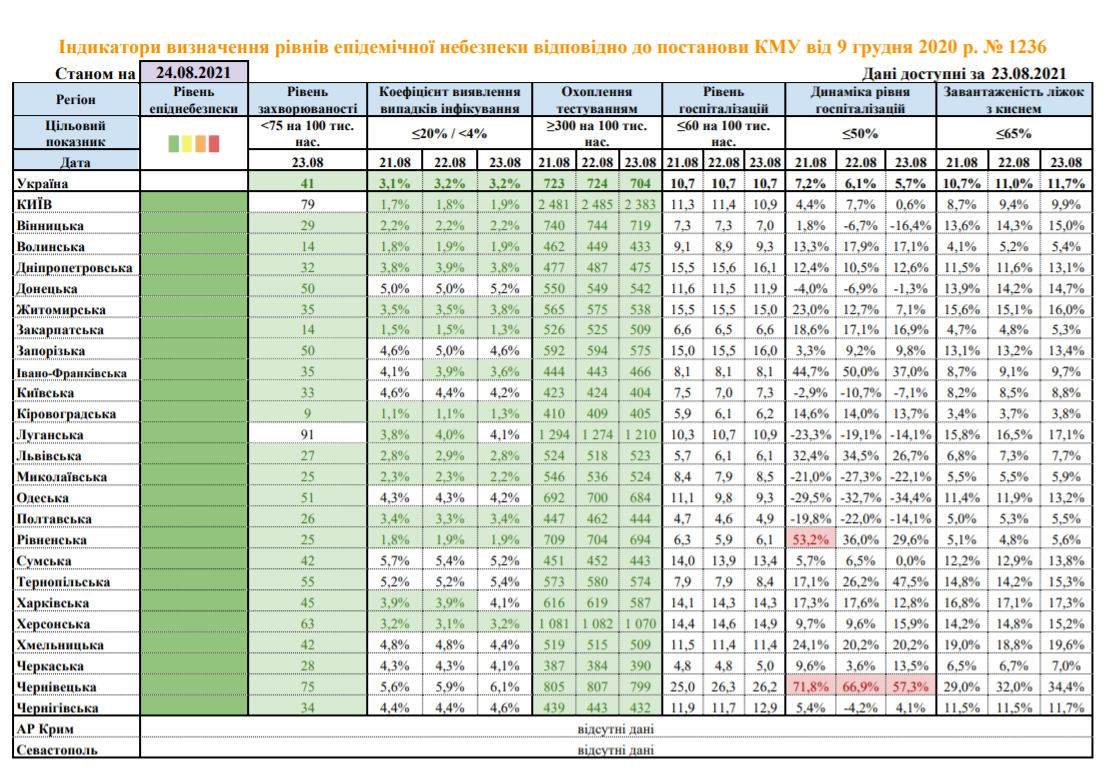 В Украине в одной области по состоянию на 23 августа превышена динамика госпитализаций пациентов с коронавирусной инфекцией COVID-19. Об этом сообщила пресс-служба Министерства здравоохранения Украины 24 августа.