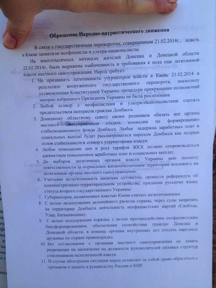 Сегодня на площади Ленина в Донецке состоялся митинг сторонников России. В листовках, которые раздавали активисты, говорится, что "народ оставляет обратиться за помощью" к России и Китаю, сообщает "Остров".