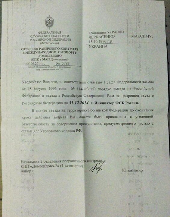 "Объяснили, что мое пребывание в РФ нежелательно, поскольку я представляю угрозу для безопасности РФ. Интересно, каким образом я могу им угрожать? Может боятся, что занесц им вирус Майдана?", – написал Черкасенко, который летел в Москву для участия в деловых переговорах.