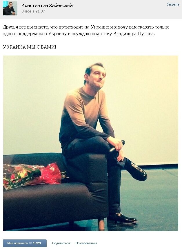 "Стоило заговорить об Украине, как сразу посыпалась критика и оскорбления в мой адрес. Друзья, остановитесь пока не поздно! Да, я за Украину и я не вижу тут ничего плохого! Раз вы так негативно относитесь ко мне и ко всем новостям, в ближайшее время удалю все аккаунты. Общайтесь с другими звездами России, например с Сергеем Безруковым и Тиной Канделаки и т.д. Желаю всем счастья и благополучия, всем, кто любит меня и не любит меня, тоже!", – заявил Хабенский.