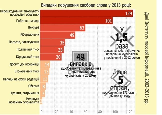 В 2013 году украинские журналисты столкнулись с многочисленными DDoS-атаками и киберпреступлениями. Их количество – 49 случаев – является беспрецедентным за все годы мониторинга ИМИ, поскольку раньше эта категория вообще не считалась отдельно.