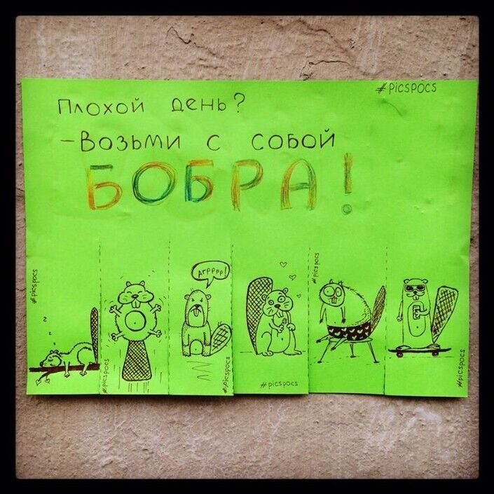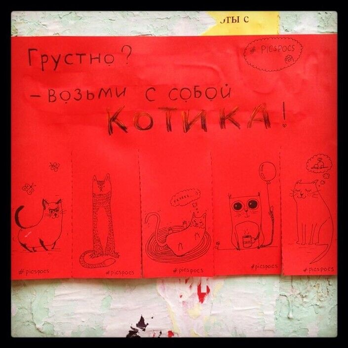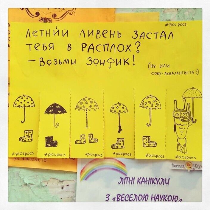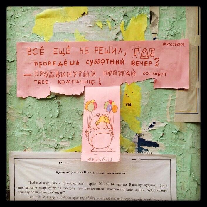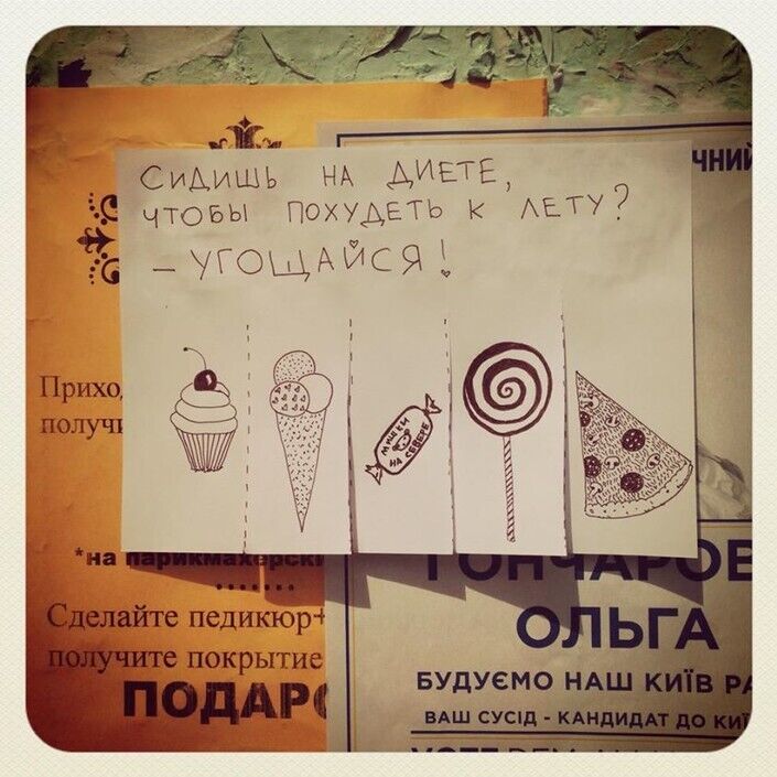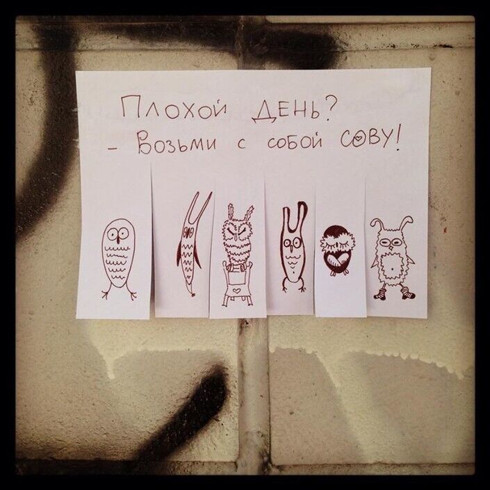 Художница из Киева Анастасия Винокурова недавно начала рисовать небольшие объявления оптимистического смысла, призванные поднять настроение жителям столицы. Она клеит эти объявления в разных уголках Киева, фотографирует их и показывает на своей странице в сети Facebook.
