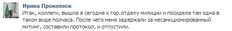 "Итак, коллеги, вышла я сегодня к городской милиции, посидела там где-то полчаса в таком виде. После чего меня задержали за несанкционированный митинг, составили протокол и отпустили", – написала Прокопюк.