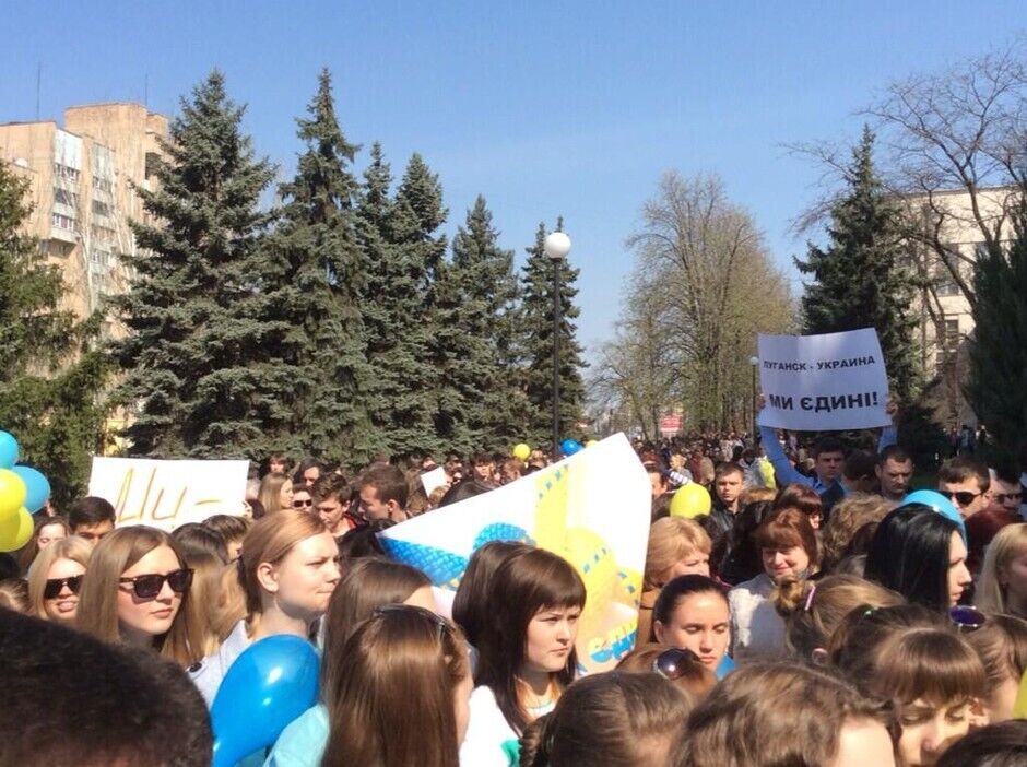 Сегодня около тысячи студентов собрались на митинг возле Луганского национального университета им Шевченко, протестуя против раскола Украины. Они принесли с собой национальную символику и плакаты с надписью: "Мы любим Украину", "Объединим страну", "Луганск – это Украина". В конце митинга, как сообщает издание 0642.ua, были принята резолюция с призывом к местным властям навести порядок в городе.