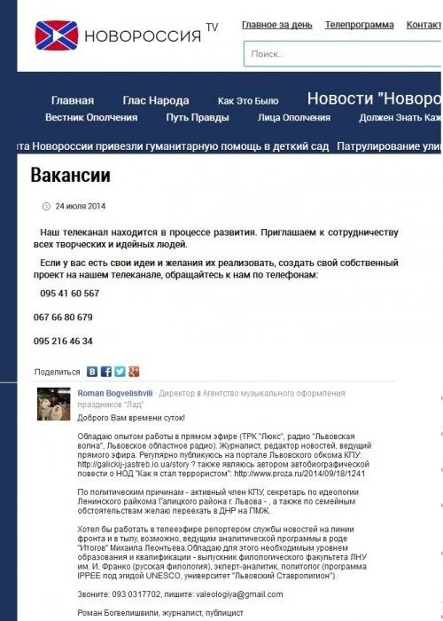 Журналист из Львова Роман Богвелишвили разместил свое резюме на сайте телекомпании "Новороссия", которая создана террористами "ДНР". Резюме он сопроводил просьбой о предоставлении ему работы и помощи в переезде на территорию "ДНР".