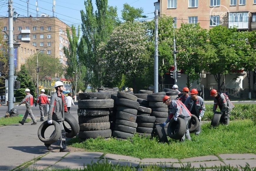 С помощью крупной техники силами мариупольцев была освобождена от баррикад из шин, мешков с песком, бетонных плит и разбитой мебели площадь городского совета.