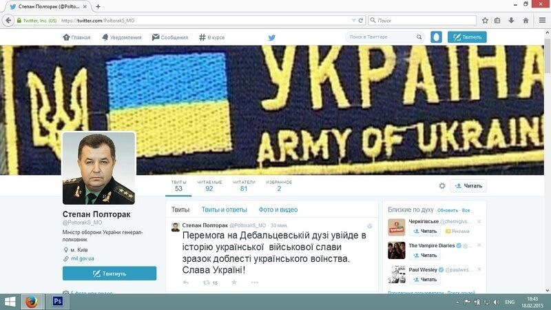 Министерство обороны Украины заявляет, что страница в Twitter, на которой от имени министра обороны Украины Степана Полторака опубликовано сообщение о "победе на Дебальцевской дуге", не является подлинной.