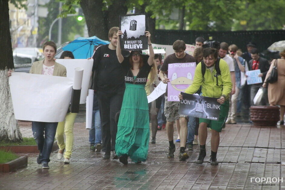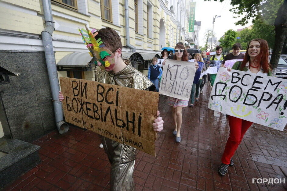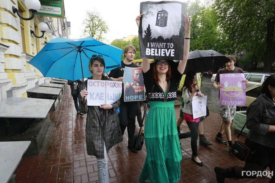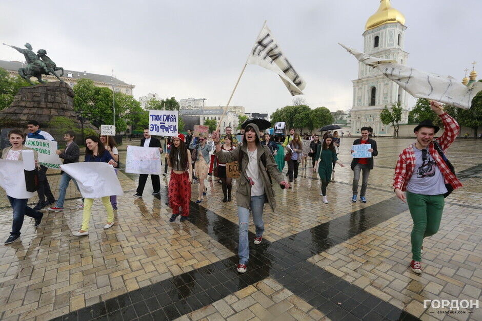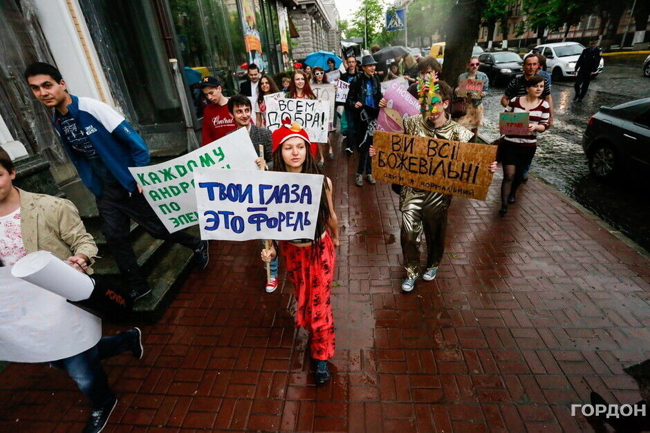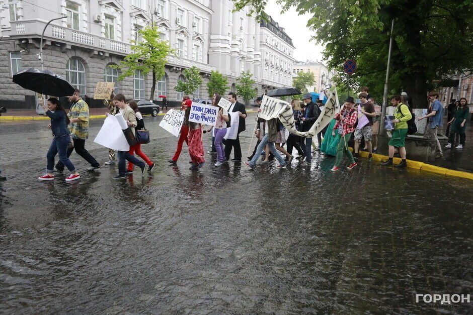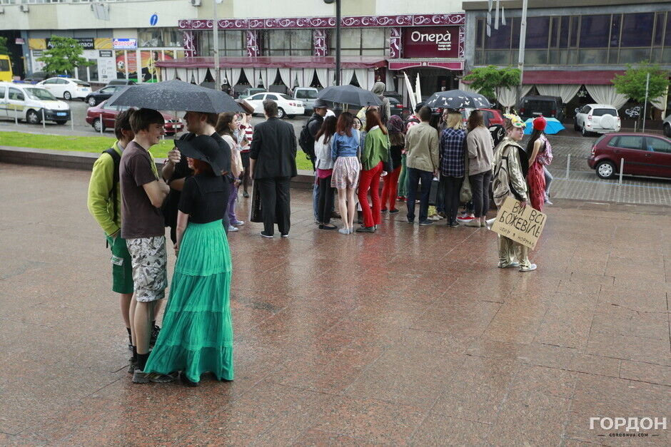 Участники "Монстрации" собрались возле Оперного театра, планируя пройти от Театральной до Контрактовой площади. Однако шествие несколько раз останавливалось из-за сильного дождя.