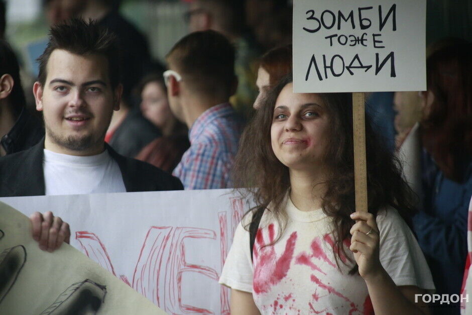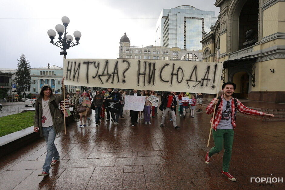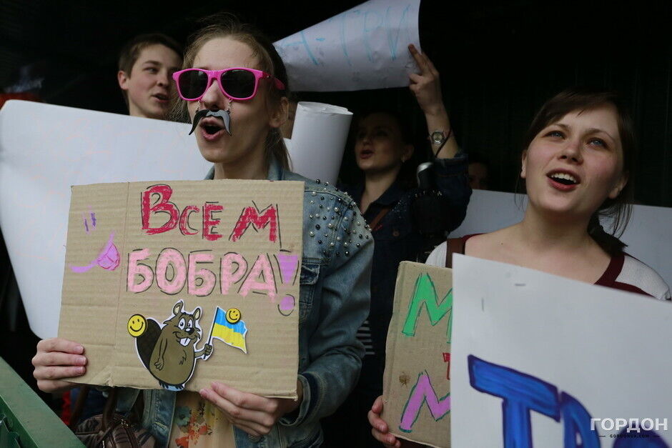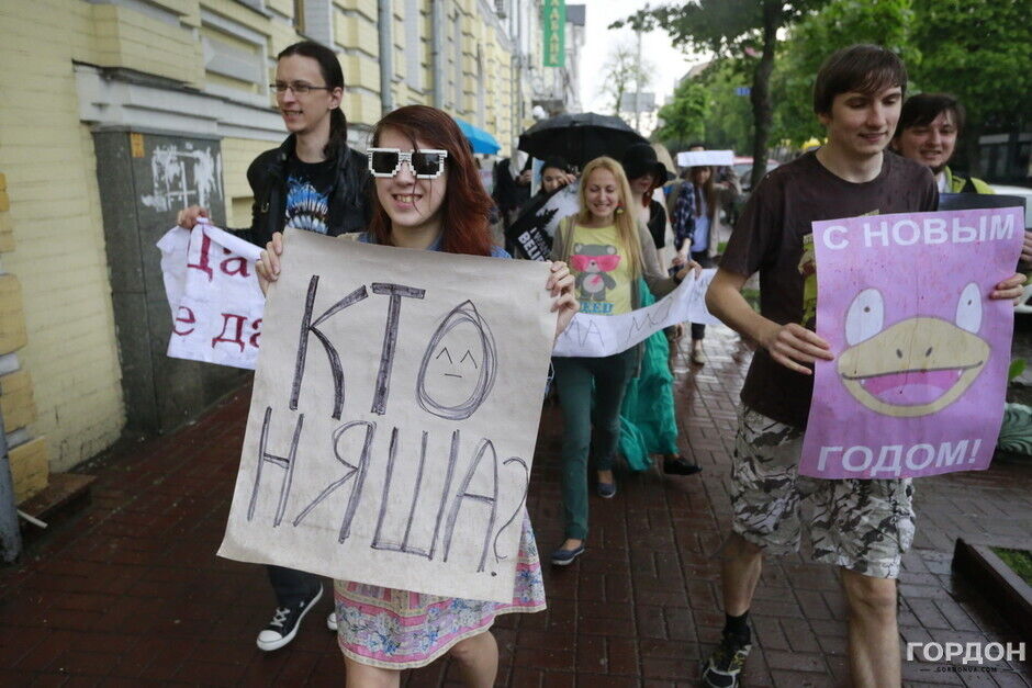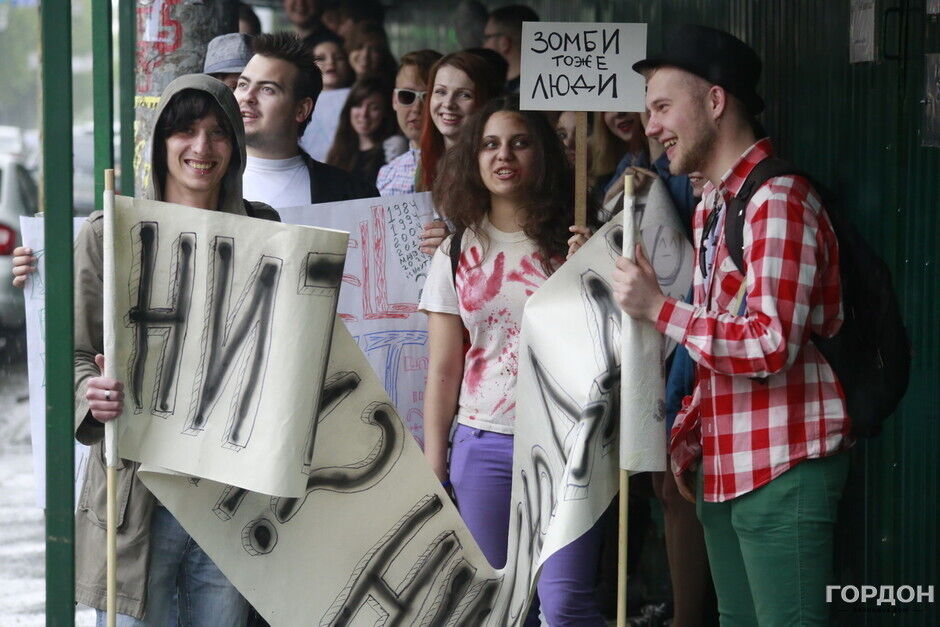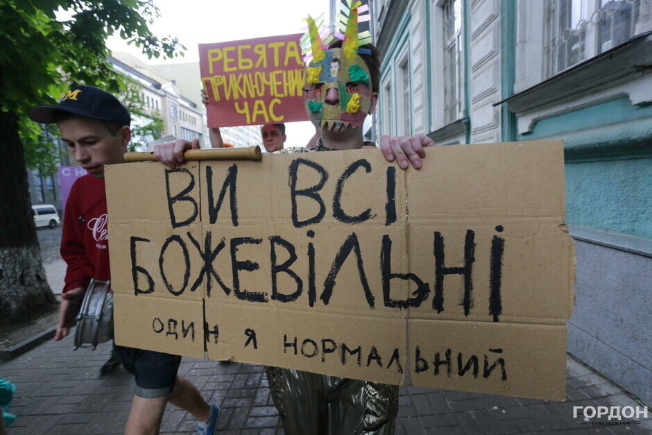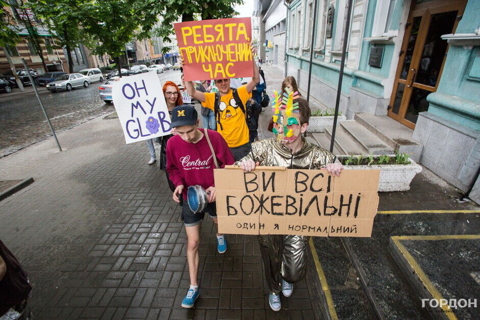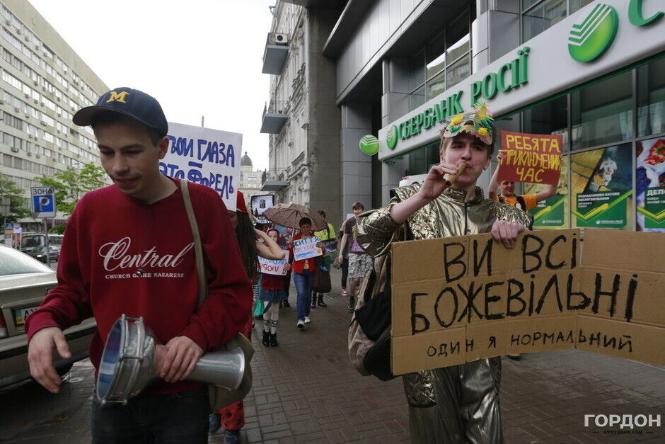 Участники "Монстрации" собрались возле Оперного театра, планируя пройти от Театральной до Контрактовой площади. Однако шествие несколько раз останавливалось из-за сильного дождя.