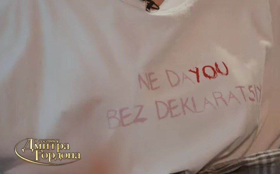 Украинская художница Соня Морозюк пришла на интервью к украинскому журналисту, основателю интернет-издания "ГОРДОН" Дмитрию Гордону в футболке с принтом "Не даю без деклараций", написанном латиницей.