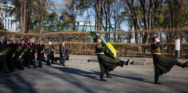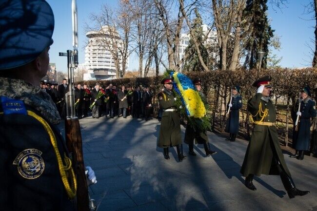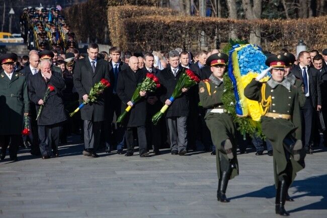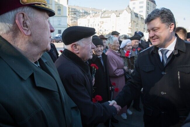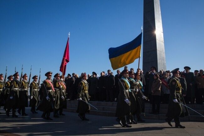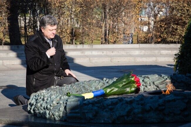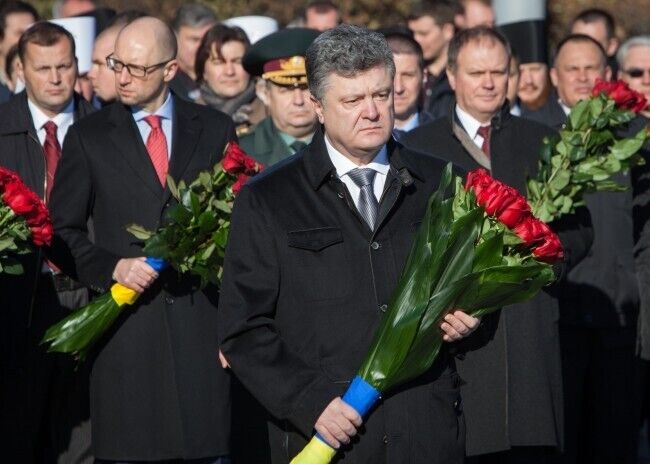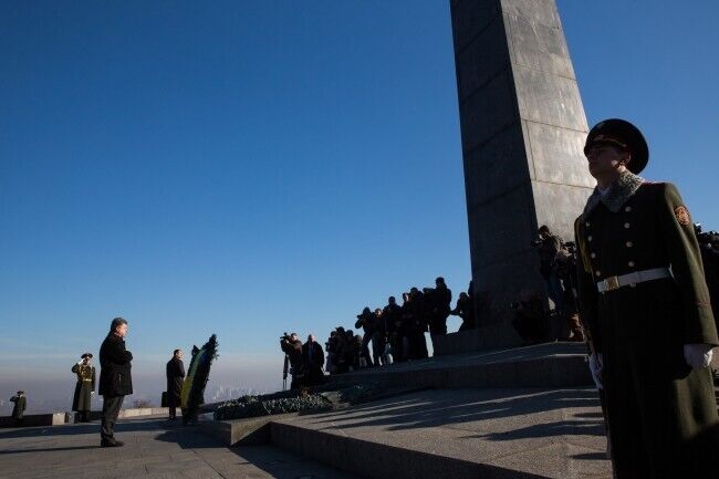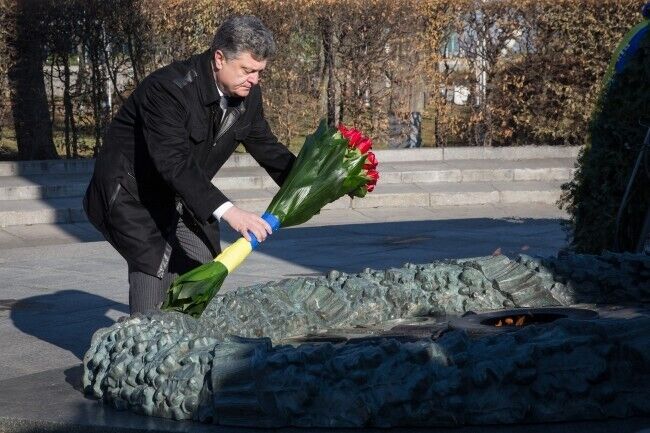 Президент Украины Петр Порошенко сегодня, 29 октября, возложил цветы к Могиле Неизвестного солдата в Киеве в связи с 70-й годовщиной со дня освобождения Украины от фашистских захватчиков. В церемонии также приняли участие премьер-министр Украины Арсений Яценюк, глава Верховной Рады Украины Александр Турчинов, ветераны, члены Кабмина, народные депутаты. Память погибших почтили минутой молчания,торжественным маршем и залпами из оружия.