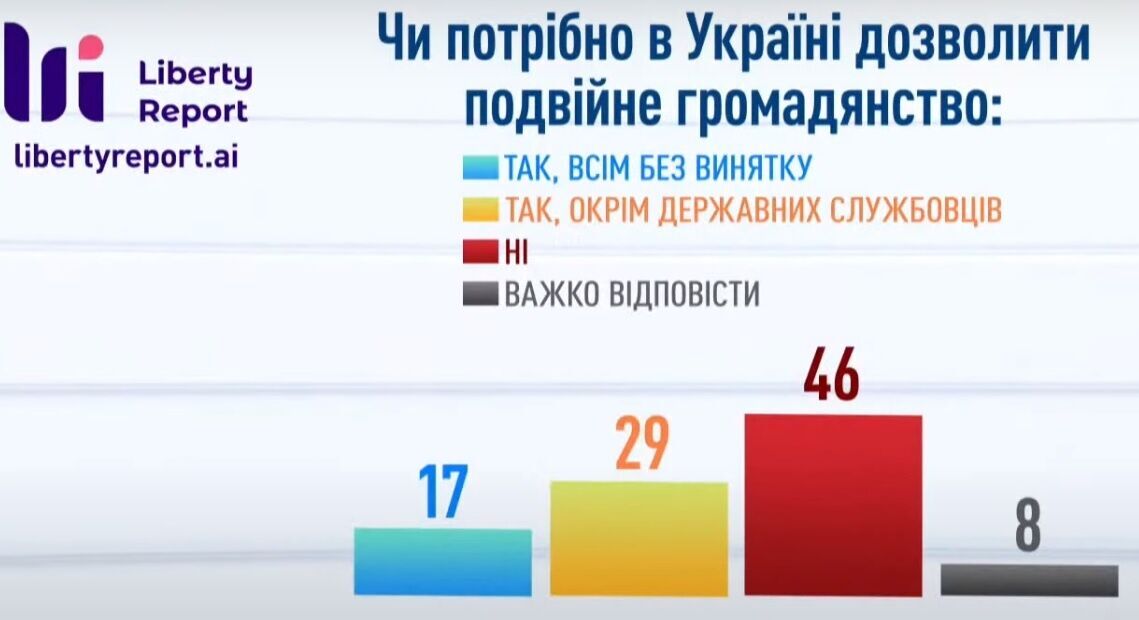 Социологический опрос компании Liberty Report по заказу студии Савика Шустера, показал, что разрешение двойного гражданства всем без исключения жителям Украины поддерживают 17% граждан.