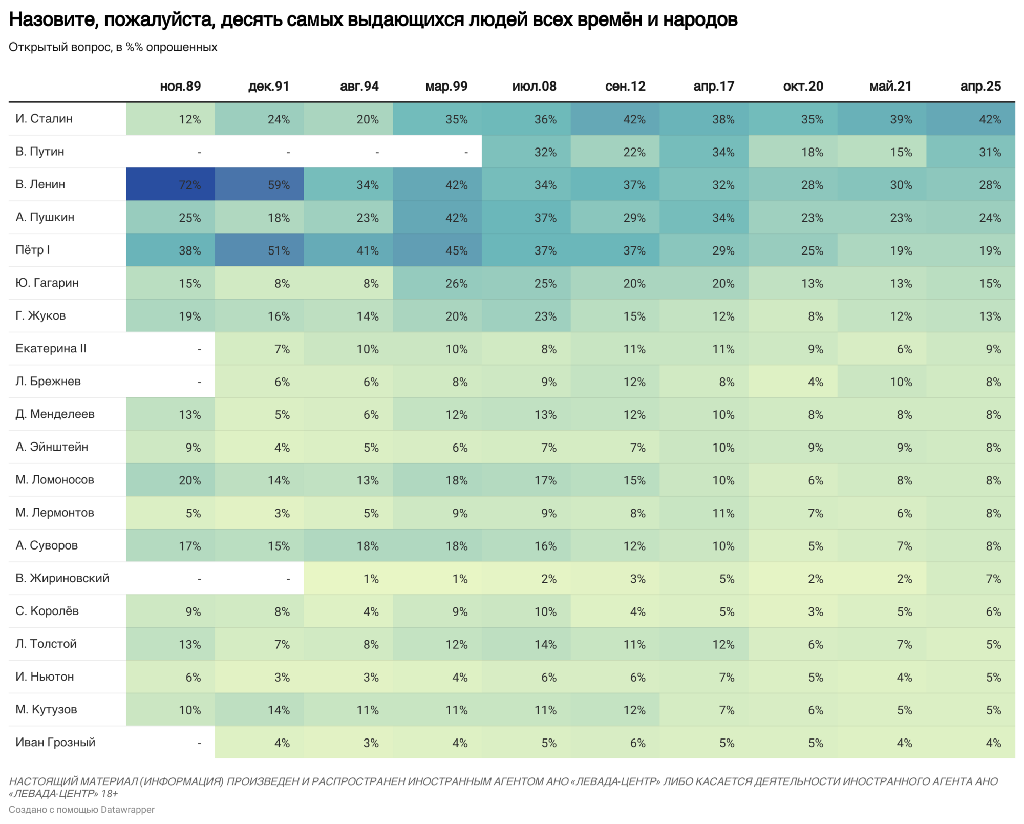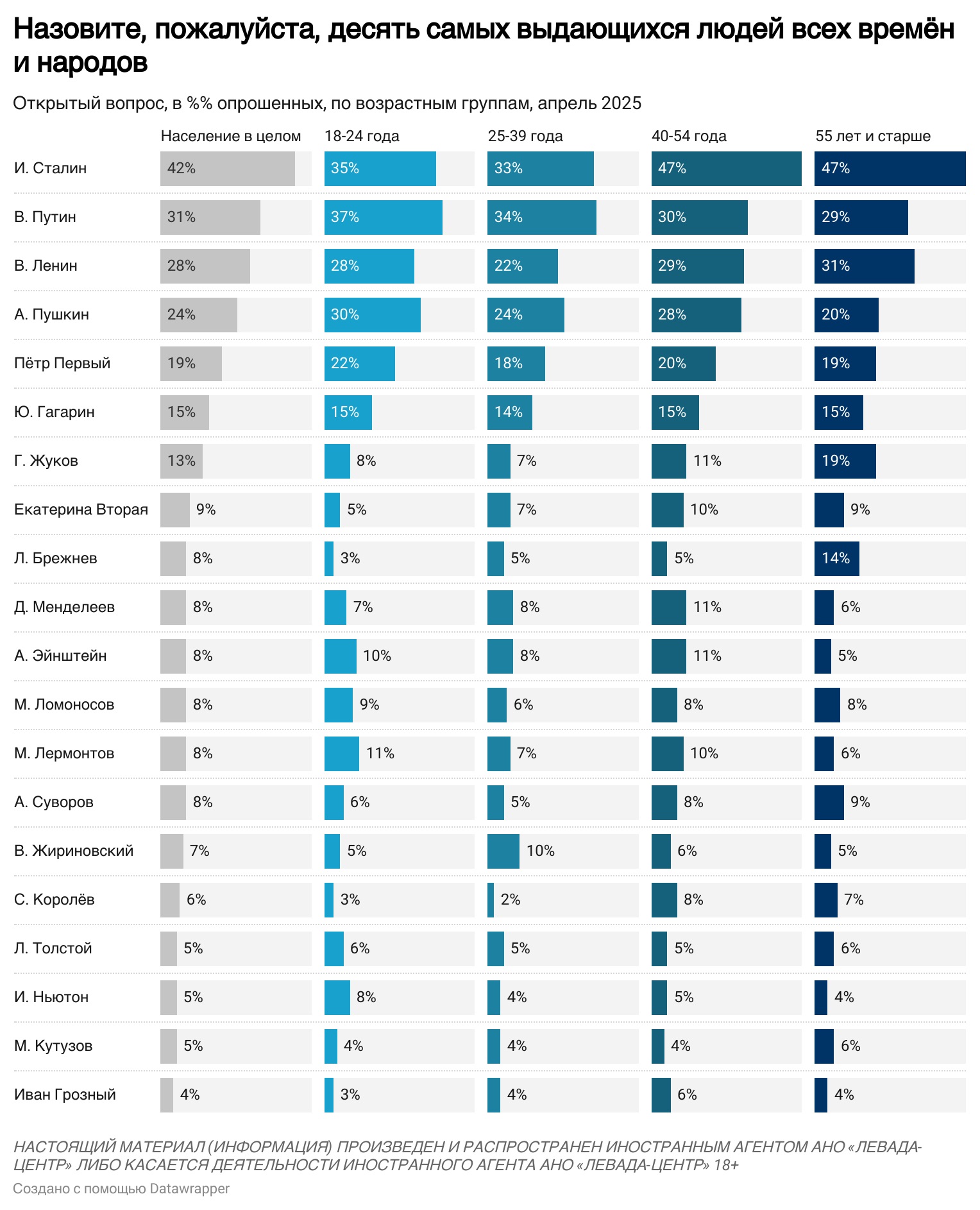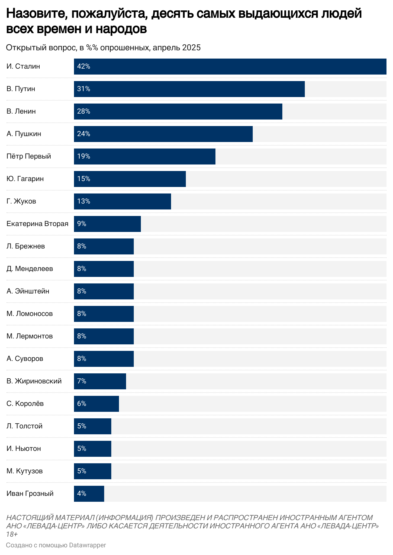 Респондентов просили назвать 10 величайших людей всех времен и народов. Большинство упоминало политических деятелей, поэтов, ученых, военачальников. В тройку лидеров вошли Сталин, вождь российских большевиков Владимир Ленин и нелегитимный президент РФ Владимир Путин.