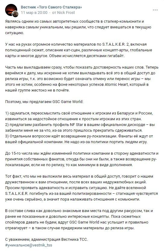 11 марта администрация группы "ВКонтакте" под названием "Вестник Того самого Сталкера" сообщила, что имеет доступ к "огромному количеству материалов по S.T.A.L.K.E.R. 2", и пригрозила слить их, если разработчики – украинская компания GSC Game World – не согласятся "переосмыслить свое отношение к игрокам из Беларуси и России".