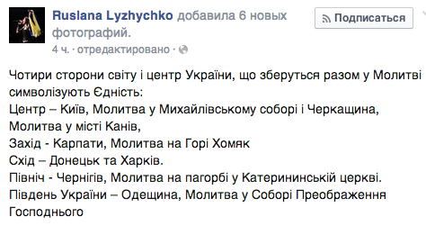 По ее словам, четыре стороны света и центр Украины, собравшиеся вместе в молитве, символизируют единство.