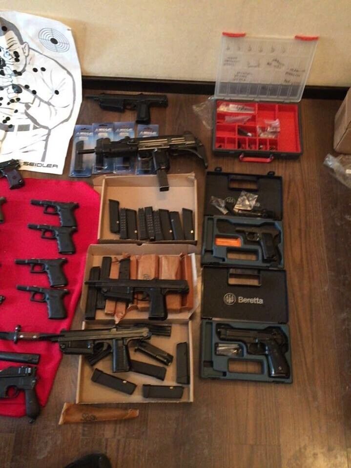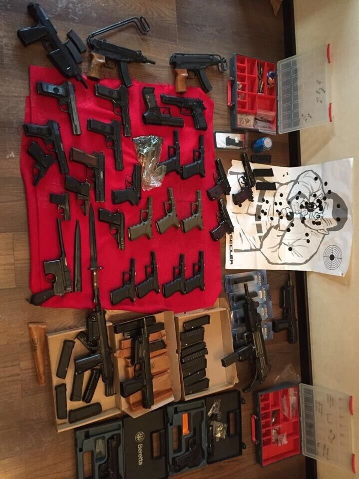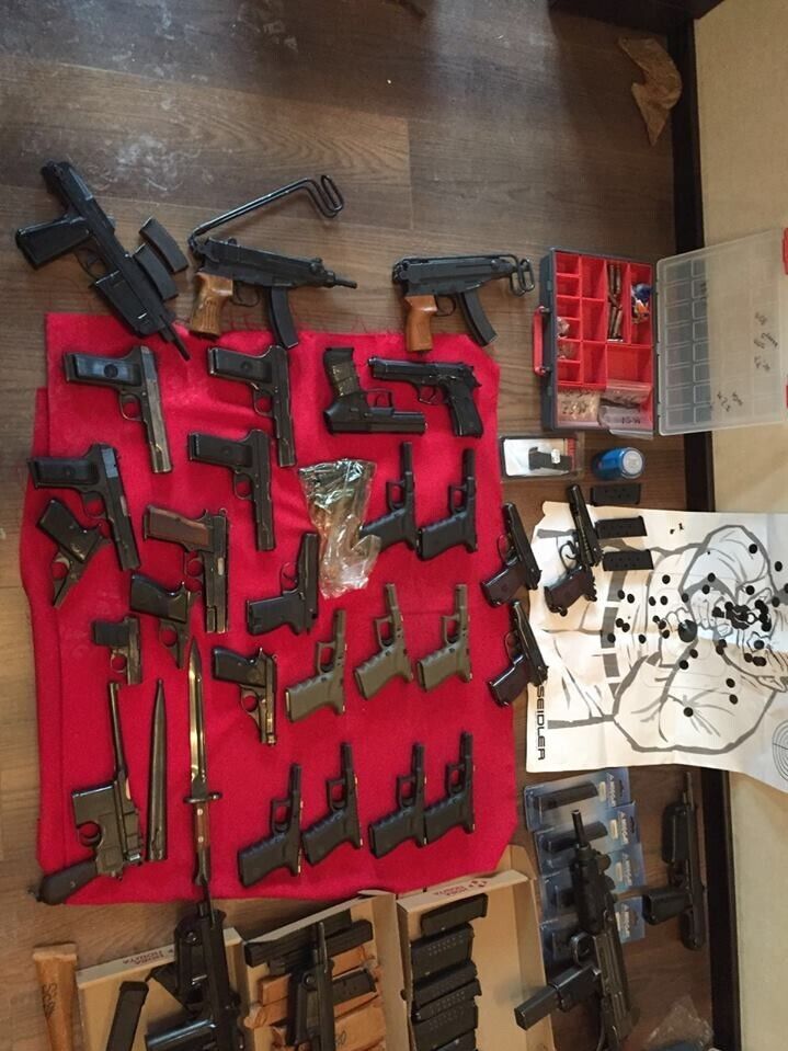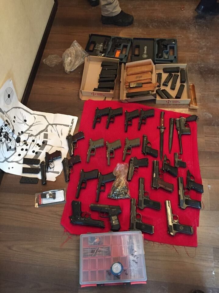 В ведомстве отметили, что во время обысков по месту жительства и работы злоумышленника правоохранители изъяли пять пистолетов "Скорпион", четыре пистолета Макарова, четыре пистолета ТТ, три пистолета "Беретта", 15 пистолетов "Глок-19", восемь пистолетов "Глок-17", три – "Глок-19" цвета хаки, один "Вальтер Р-99", один "Вальтер Р-38", пистолет-пулемет "УЗИ", а также запчасти к нарезному огнестрельному оружию и "большое количество холодного оружия".