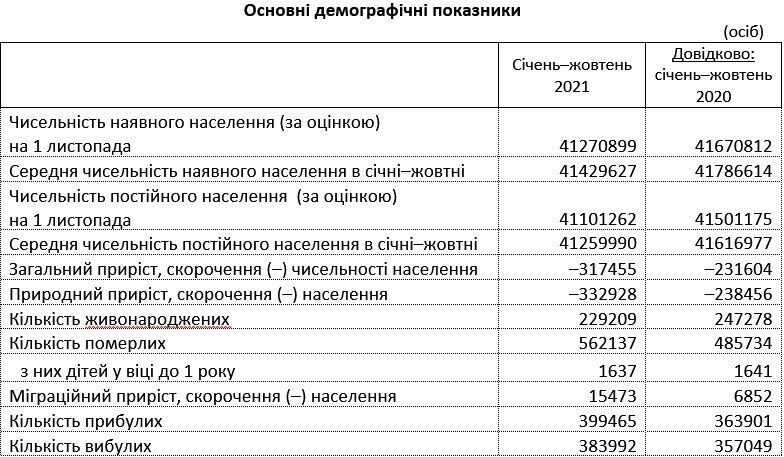 На 1 ноября 2021 года численность наличного населения в Украине составила 41,3 млн человек. С начала года население Украины сократилось на 317 тыс. человек, родилось за этот период 229 тыс. человек (в прошлом году – 247 тыс.), миграционный прирост составил 15,5 тыс. человек (в 2020-м – 6,9 тыс.).