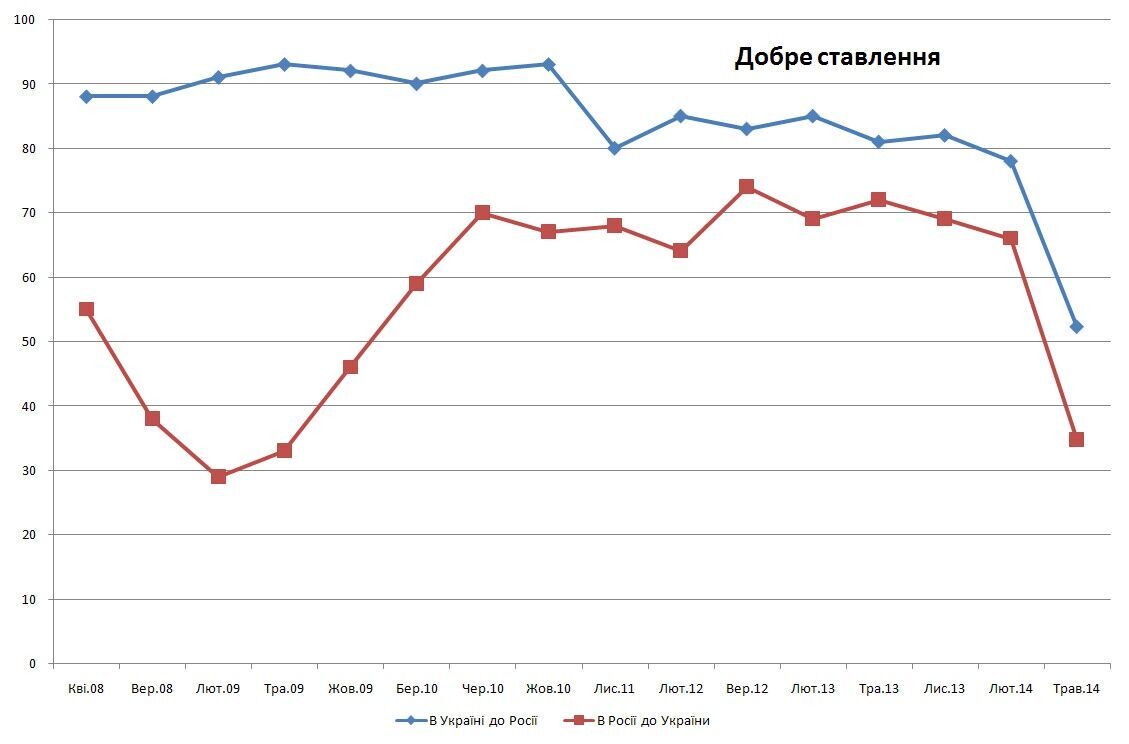 С февраля по май 2014 года количество украинцев, позитивно настроенных по отношению к России, упало с 78% до 52%. Доля украинцев, негативно относящихся к РФ, выросла в три раза – с 13% до 38%.