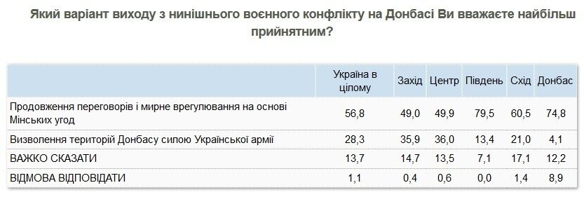 56,8% опрошенных Киевским международным институтом социологии считают, что конфликт на востоке Украины нужно решать мирным путем, 28,3% поддерживают освобождение оккупированных территорий Донбасса силой.