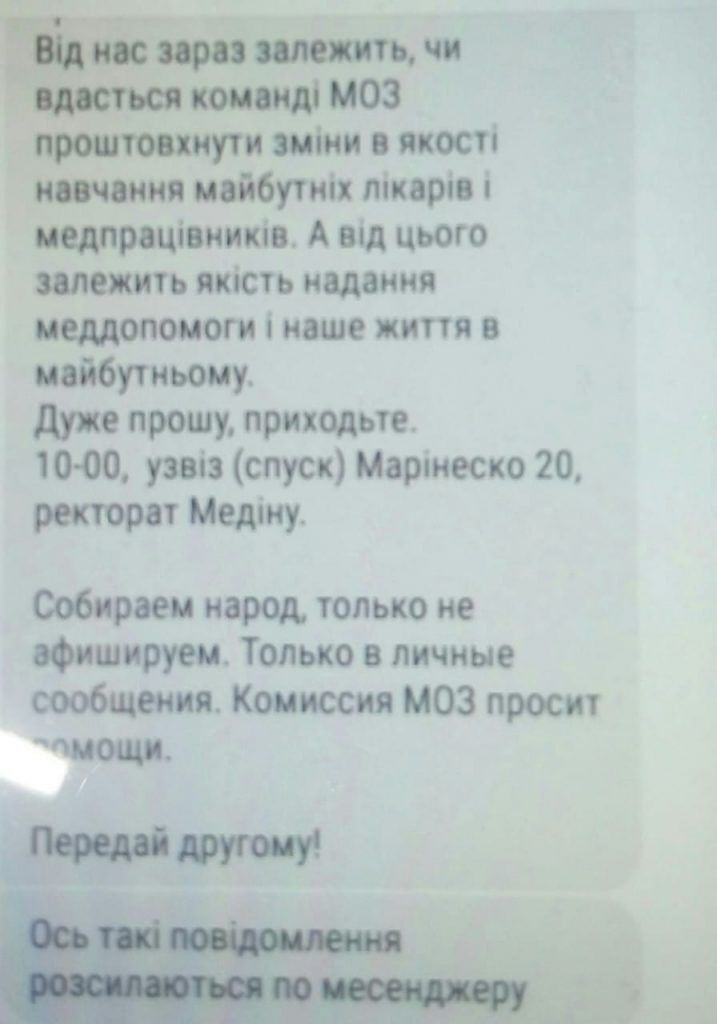 "Собираем народ, только не афишируем. Только в личные сообщения. Комиссия МОЗ просит о помощи", – сказано в сообщении, скришот которого опубликовал "Стоп коррупции".
