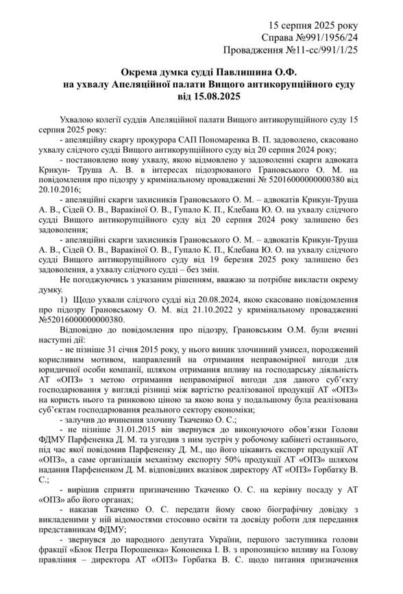 "Из свидетельских показаний не усматривается, что Грановский самостоятельно или через других лиц давал поручение должностным лицам ПАО "ОПЗ" на совершение действий, которые, по версии следствия, нанесли ущерб предприятию. Также, по мнению судьи, не подтверждают этого ни контракты с компанией Newscope Estates Limited, ни заключения экспертов, ни протоколы осмотров и допросов. Протокол обзора телефонных соединений, которым обосновывалось общение Грановского с другими фигурантами, не содержит подтверждения принадлежности номеров подозреваемому", – цитирует "Главком" особое мнение судьи Павлишина.