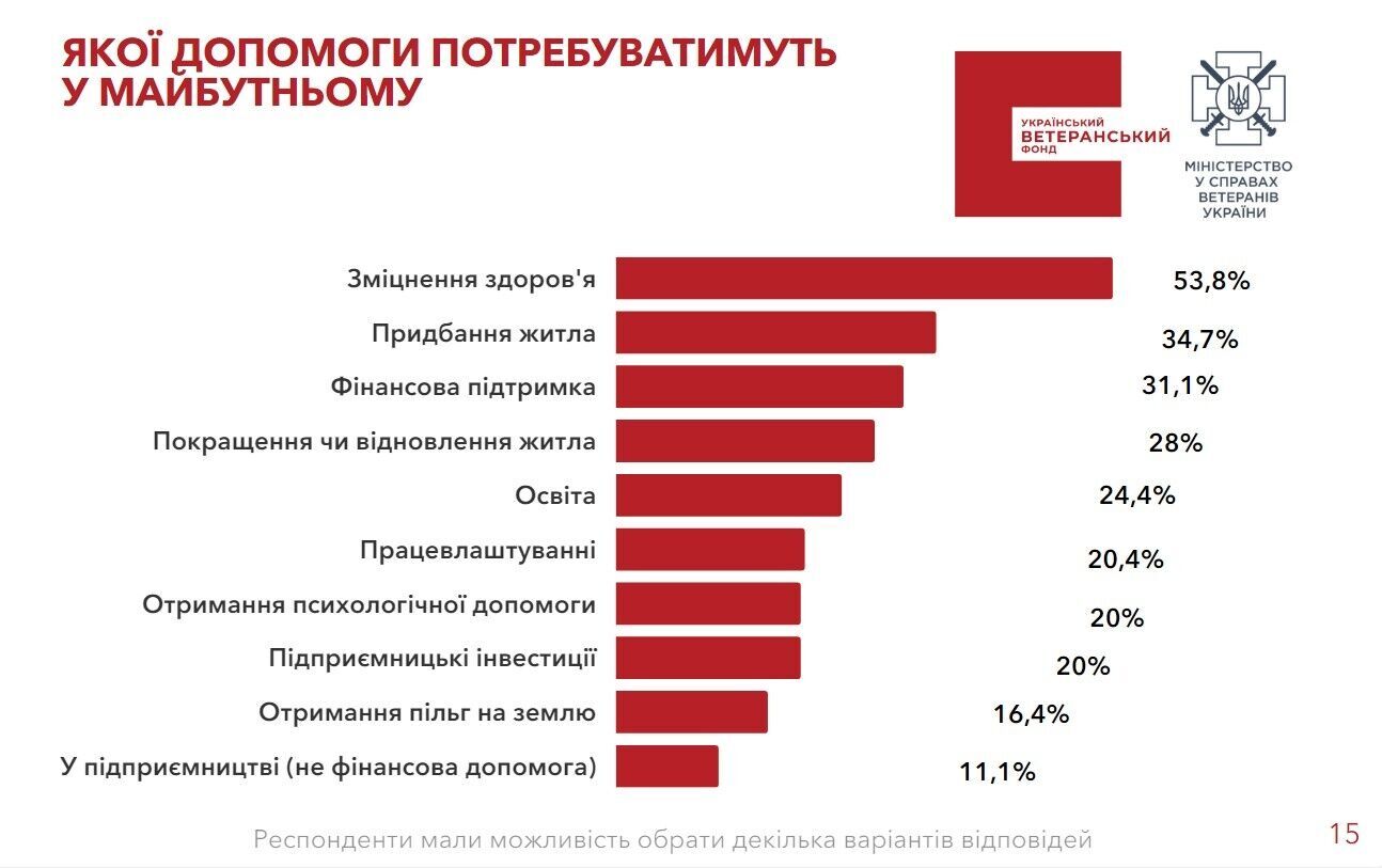 В будущем ветераны хотели бы укрепить здоровье (53,8%), приобрести жилье (34,7%), а также иметь финансовую поддержку (31,1%). 16,4% хотели бы получить льготы на приобретение земли.
