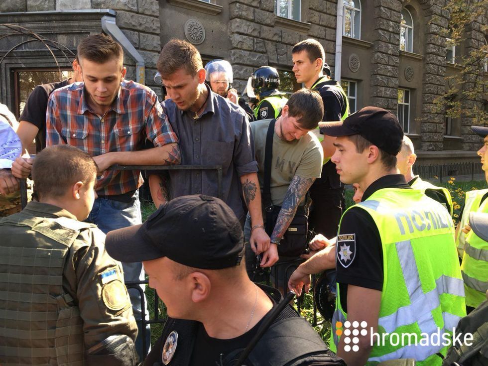 Участники акции протеста у стен Администрации Президента приковали себя наручниками и пообещали находиться там до тех пор, пока их требование не будет выполнено.