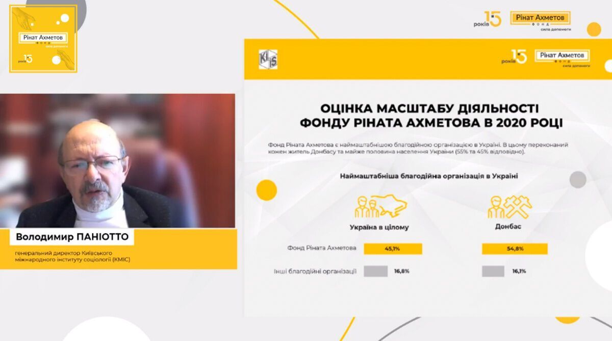 "Ринат Ахметов еще в феврале 2020 года выделил свыше 300 млн грн на помощь стране в борьбе с COVID-19. Это крупнейший вклад одного благотворителя в государственную медицину Украины. Для эффективной работы Фондом был создан проект "Борьба с COVID-19 в Украине", который не имеет аналогов в стране. Это самая крупная, системная и масштабная частная инициатива, направленная на помощь государственным медучреждениям в борьбе с коронавирусом. Украина знает о роли помощи Фонда Рината Ахметова в борьбе с пандемией коронавируса. Ее назвал очень важной практически каждый житель Донбасса (91%) и двое из трех украинцев (62%)", – рассказала директор департамента коммуникаций Фонда Юлия Ершова.