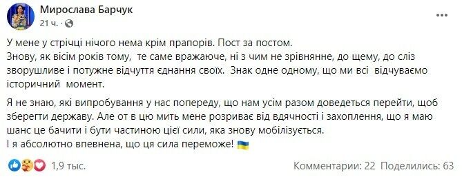 "Не знаю, какие испытания у нас впереди, что нам всем вместе придется пройти, чтобы сохранить государство. Но вот в этот момент меня разрывает от благодарности и восхищения, что у меня есть шанс это видеть и быть частью этой силы, которая снова мобилизуется. И я абсолютно уверена, что эта сила восторжествует", – пишет она.