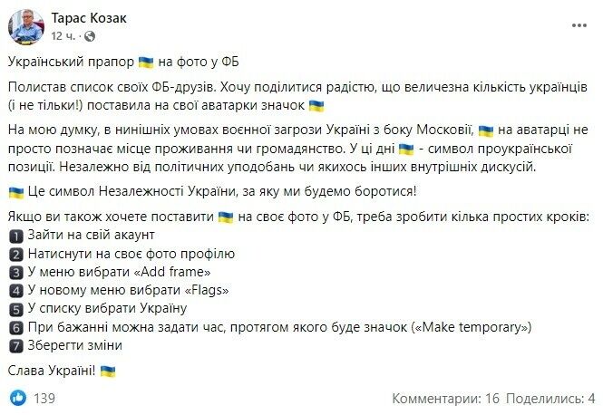Депутат Киевсовета от партии "Голос" Тарас Козак считает, что в нынешних условиях военной угрозы Украине со стороны РФ флаг Украины на аватарке не просто обозначает место жительства или гражданство.