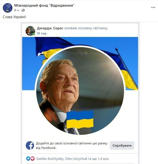 Международный фонд "Відродження" разместил в Facebook шутливую аватарку американского финансиста Джорджа Сороса, на которой тоже есть украинский флаг.