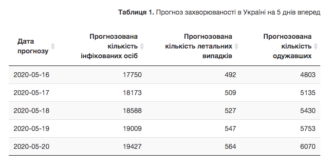 "Результаты краткосрочного прогнозного моделирования количества больных COVID-19 в Украине 16–20 мая получены с использованием многослойной нейронной сети Back Propagation на основе механизма "скользящего окна". Для Украины в этот период характер развития эпидемии приобретает более четкий линейный характер с уровнем плато 400–550 новых инфицированных в день", – сказано в прогнозе.