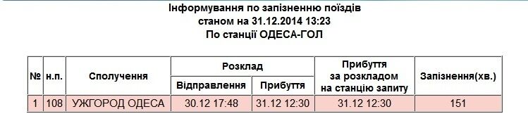 На сайте "Укрзалізниці" можно проверить время опоздания по каждому поезду. Например, отмечается, что поезд "Ужгород – Одесса" задерживается на 2,5 часа.