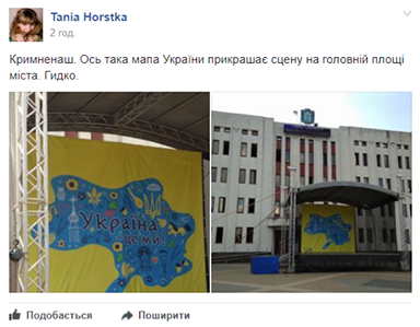"Крымненаш. Вот такая карта Украины украшает сцену на главной площади города. Противно", – отметила она.