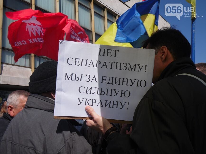 На митинге за референдум люди стояли с флагами «Русского блока», КПУ и Украины. Они выступали за Таможенный союз и против сближения с ЕС. На другом митинге под желто-голубыми флагами днепропетровцы выступили за единство Украины.