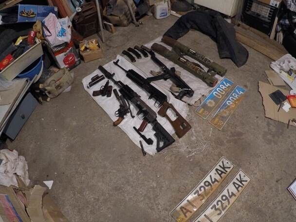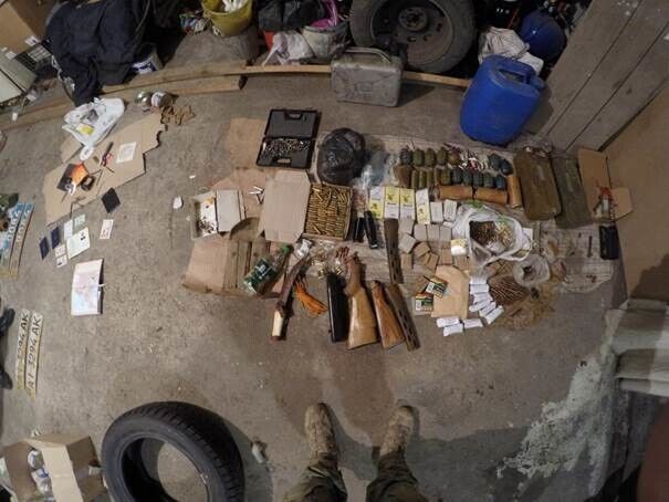 При осмотре гаража злоумышленника сотрудники СБУ изъяли два реактивных гранатомета, снайперскую винтовку, автомат Калашникова, пистолет-пулемет времен Второй мировой войны, револьвер "Наган", пистолет Макарова, 20 гранат РГД и Ф-1, большое количество патронов различного калибра, а также различные запчасти и шнуры к взрывчатке.